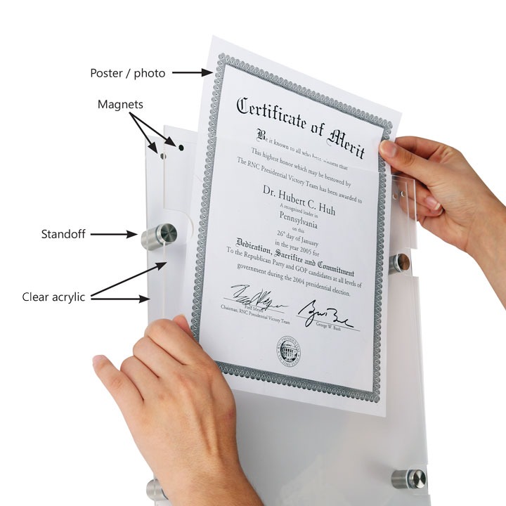 Akrilik birbirini mıknatıs yardımı ile tutarak, görselin iki akrilik çerçeve arasında kalmasını sağlar. Kromaj bağlantı aparatları ile birlikte şık bir görünüm elde edebilirsiniz.
