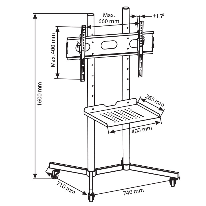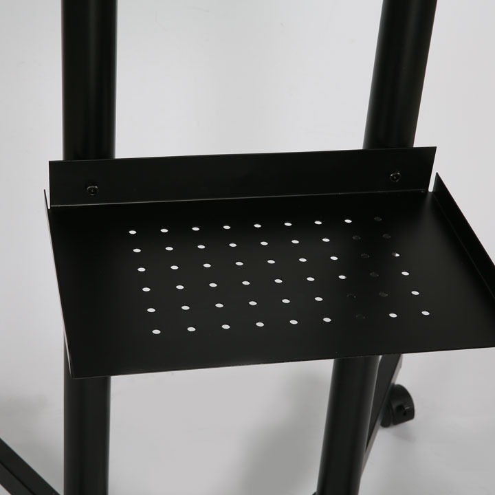 Ayrıca sabit durması için tekerlekler kilitlenebilir. Televizyon standı 30"-65" arası, max 60 kg ağırlığındaki ekranlar için uygundur. Ekran açısı ve yüksekliği kolayca ayarlanabilir. Kamera yerleştirilebilecek üst rafı mevcuttur. Ayrıca televizyon sehpası olarak da kullanılabilir.