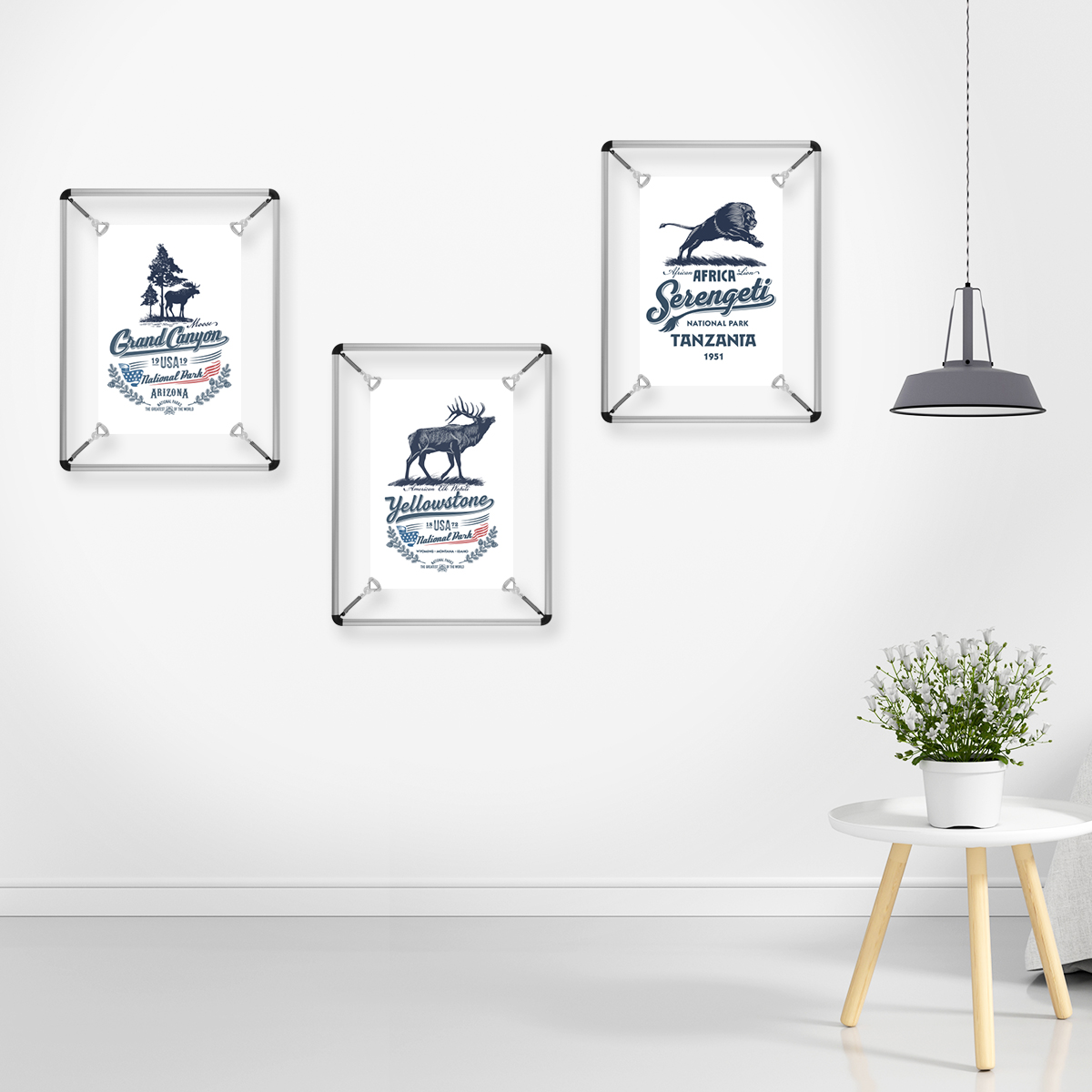 yaylar posterin gergin durmasını, plastik klipsler posterin kolayca değiştirilmesini ve