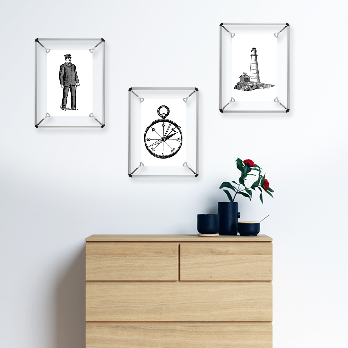 yaylar posterin gergin durmasını, plastik klipsler posterin kolayca değiştirilmesini ve