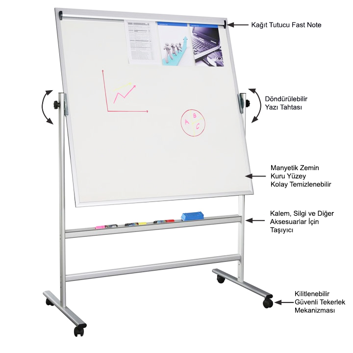 Bizlere ihtiyacımız olandan da fazla özellik sunan bu ürün ayarlanabilir ve dönebilir tahtası sayesinde istenilen açıda kullanılabilir. Alüminyumdan yapılmış iskeleti üzerinde tahta kalemi, silgi gibi yazı tahtası aksesuarlarını koyacak bir bölme de vardır. Beyaz yazı tahtası birçok işlevli özelliği dışında beyaz yüzeyi sayesinde projeksiyon perdesi olarak da kullanılır.