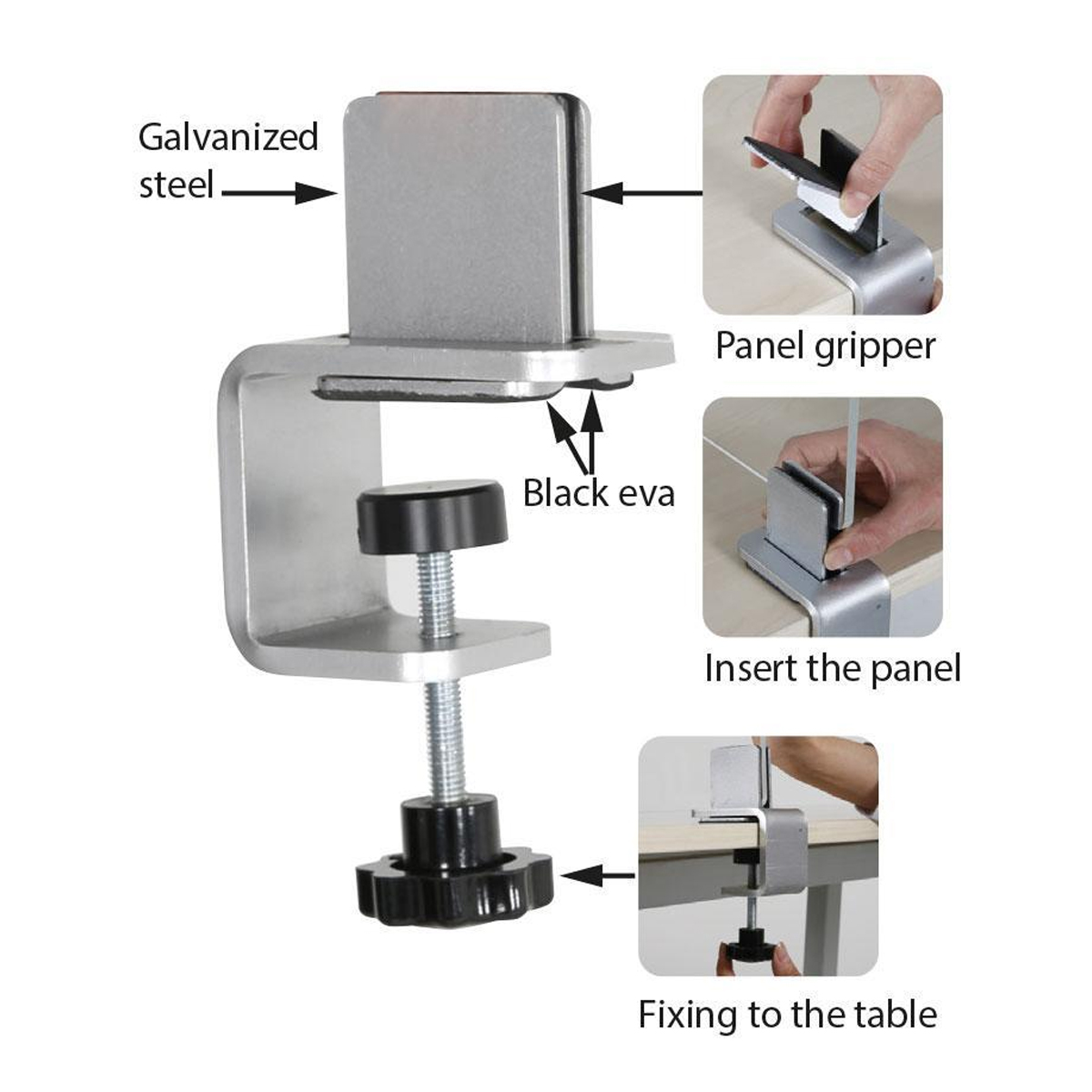 Mid Section Kelepçe Kitli Buzlu Seperatör, masa, tezgah veya kasiyer alanını bölmek için tasarlanmıştır. Kalınlığı 6mm’ den 40mm’ ye kadar olan masalar için uygundur.Masaya zarar vermemesi için siyah pedler ile kaplanmıştır. Panellerin kalınlık ölçüsü min. Bölmeler kolayca çıkarılabilir ve yeniden yerleştirilebilir. Mid Section Kelepçe Kiti ile masa yada panelin üzerindeki gerekli alan kolayca ayarlanabilir. Uygulaması kolay kelepçeler masa yada sıraya kolayca eklenebilir. Delme gerektirmez, şık siyah düğmeyi gevşeterek masa üstünde kolayca kaydırılabilir. Buzlu Seperatör’deki bölümler, her kişi için kişisel bir çalışma alanına izin verir. Dikkat dağıtıcı unsurlardan etkilenmemeyi ve sosyal mesafeyi korumayı sağlar. Paneller kolaylıkla hareket ettirilebilir ve yeniden monte edilebilir. Buzlu Seperatör Akrilik’ ten imal edilmiştir.
